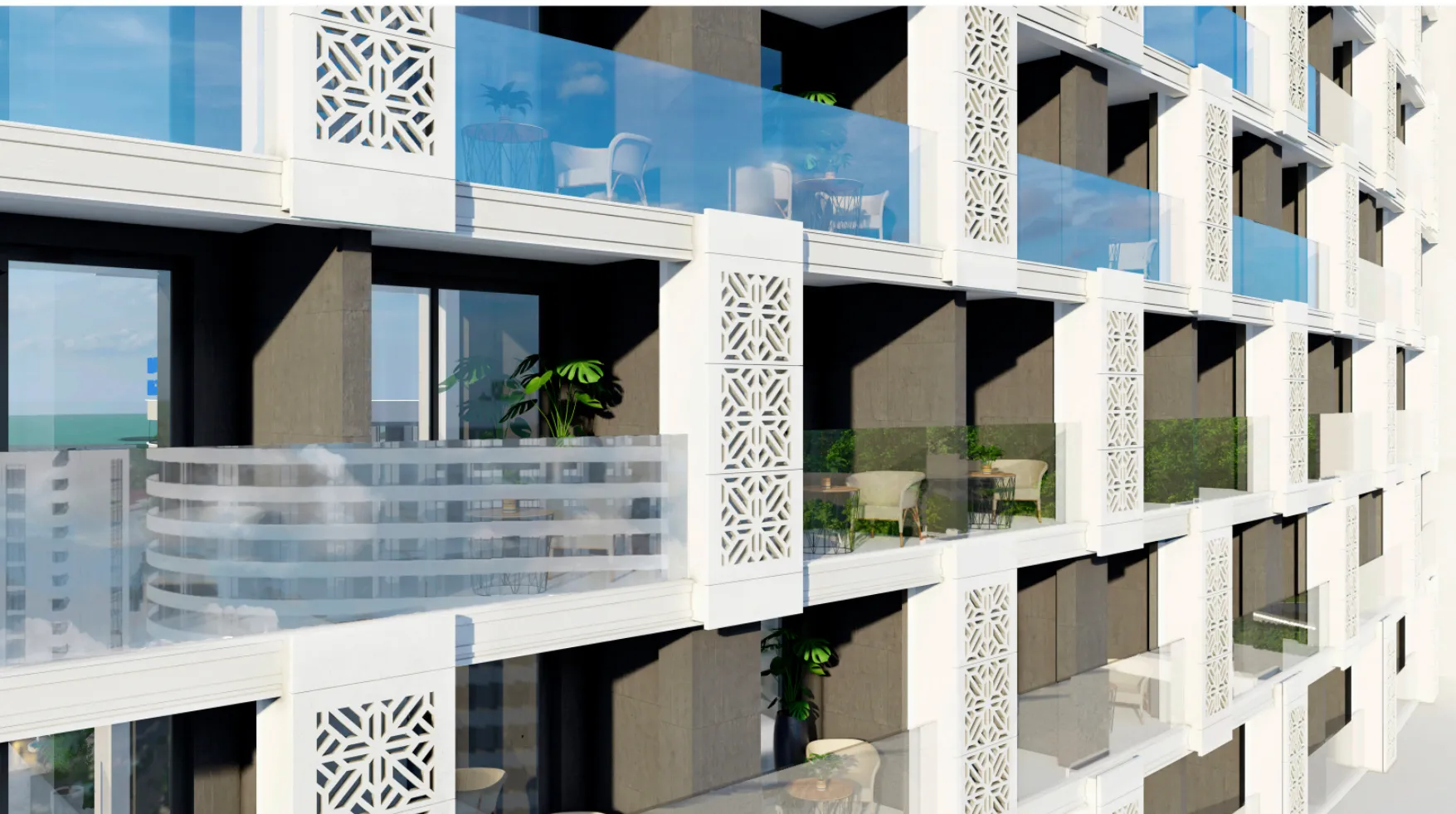 Комплекс спроектирован в современном дизайне, визуализируя парящую в небе птицу и лучшим образом вписывается в морской стиль курортного города Сочи. Фасады двух 12-этажных корпусов обрамлены известняковыми плитами белого цвета и черным сланцем природного происхождения, вертикальное озеленения фасада увеличивает художественную выразительность архитектуры комплекса. Геометрическая форма балконов с панорамными окнами идеальна, в окружении зеленого массива и бескрайнего морского простора наш экстерьер безупречен.